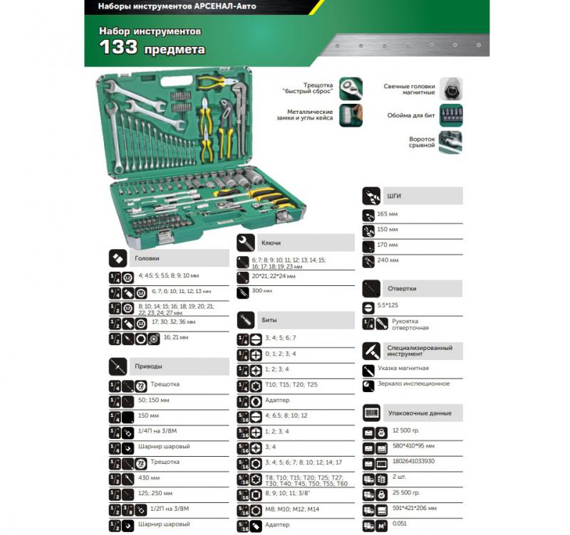 | ТХ (таблица) (Описание) : | Серия Авто Заводской артикул AA-C1412P133 Количество предметов 133шт Габариты 580*410*95 мм Вес 12.5кг Производство Тайвань Кейс Пластик |