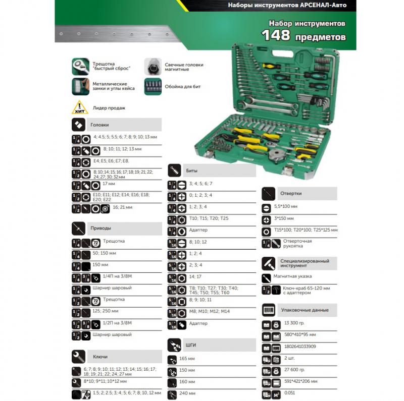 Набор инструментов 148 предметов общефункциональный + замена масла Арсенал AA-C1412P148 разработан для профессионалов с упором на замене масла. Особенностью данного набора является максимально широкий ассортимент ключей и бит, необходимых для ежедневной работы автослесаря, а также специализированный инструмент под конкретные задачи. Сталь, из которой изготовлен инструмент, легирована хромом и ванадием с нанесением никелевого покрытия. Особопрочные кейсы с металлическими углами, усиленными петлями и стальными замками делают кейсы Арсенал незаменимыми для тех, кто ценит надёжность во всём. Наборы инструментов Арсенал имеют пожизненную гарантию. Инструмент Арсенал - Специально разработан для Российских условий!!!