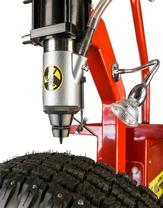 Правильная ориентация шипов и подача их в шипопровод осуществляется при помощи шипоподающего устройства. При заполнении шипопровода происходит автоматическое отключение сепаратора, что увеличивает ресурс шипоподающего устройства и снижает уровень шума при работе. Регулируемая конструкция рабочего стола обеспечивает правильное расположение шипуемых покрышек разных типоразмеров. Полуавтомат оборудован системой подготовки сжатого воздуха с целью увеличения срока службы узлов шиповальной головки, лампой подсветки рабочей зоны для обеспечения высокой производительности труда оператора.