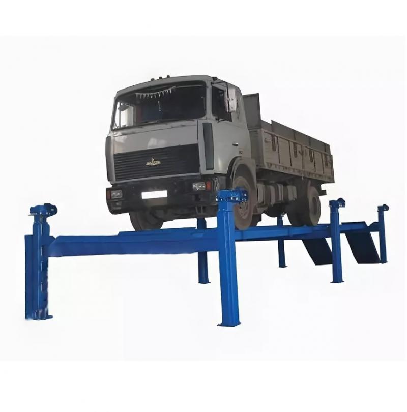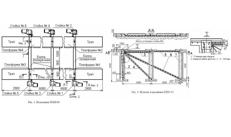 Подъемник состоит из шести стоек 1, 2, 3, 4, 5, 6 (см. Рис.), каждая из которых имеет электромеханический привод, состоящий из электродвигателя и червячного редуктора, грузовой винт, рабочую и страхующую гайки, конечные выключатели верхнего и нижнего положений балок. Стойки попарно соединены поперечными балками лежащими на опорных шайбах рабочих гаек. На поперечных балках установлены платформы фиксируемые в зависимости от колеи автомобиля. На стойке 1 установлен шкаф аппаратный, с панелью электрооборудования, лампочками «Сеть» и «Аварийное отключение», кнопками управления «Вверх» и «Вниз» и с автоматическим выключателем. Стойки подъемника крепятся на раме, состоящей из трех оснований. Рама в зависимости от пожелания заказчика может быть забетонирована в пол, либо установлена на поверхности пола с возвышением над уровнем пола на 74 мм.