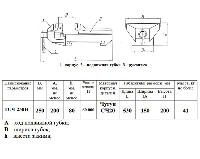 | ТХ (таблица) (Описание) : | Ширина губок, мм 250 Усилие зажима, Н 60 000 Материал корпуса чугун Ход подвижной губки, мм 200 Высота зажима 80 Габариты, ДхШхВ 530x150x200 Масса, кг ~41 |