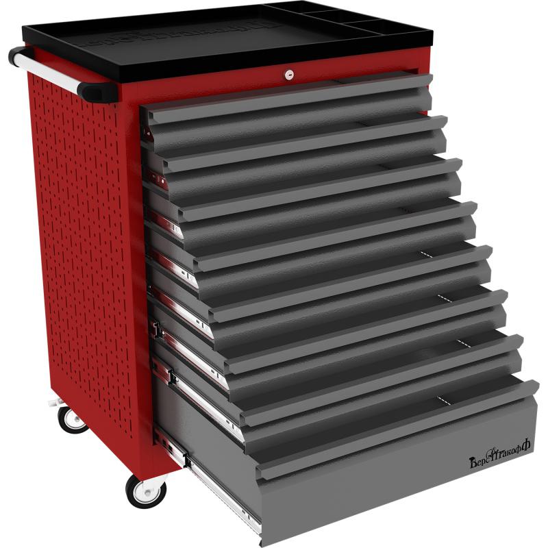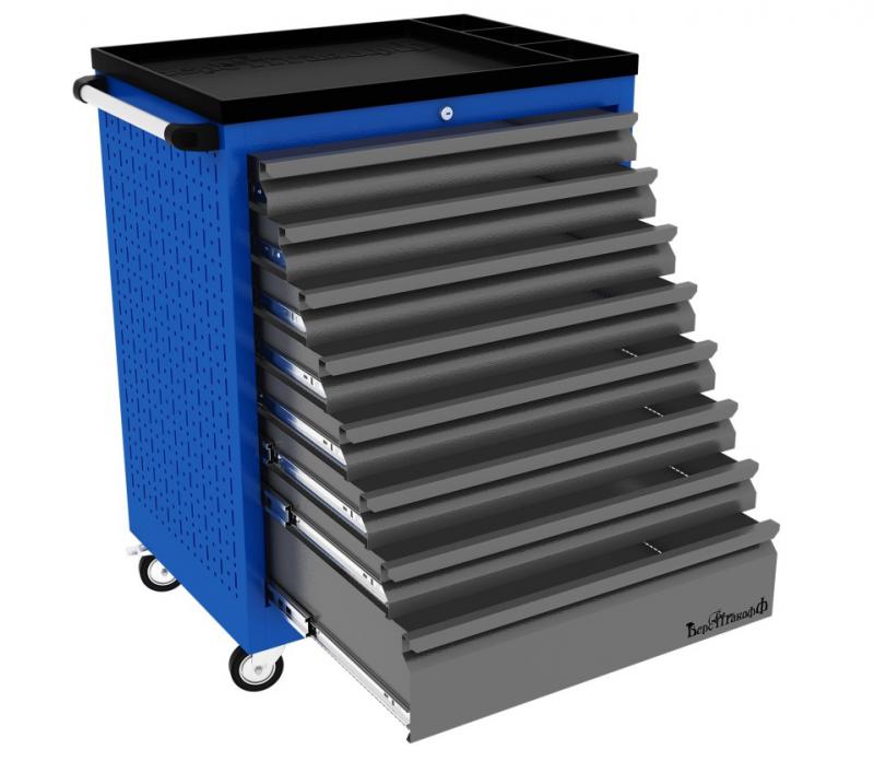 Тележки инструментальные серии PROFFI 950 предназначены для использования на предприятиях любого профиля занятых ремонтом и изготовлением различной продукции. На боковые стенки инструментальной тележки нанесена перфорация размером 25х25 мм и диаметром отверстия 8 мм, что позволяет устанавливать на них навесной инструмент или крючки. Наибольшей популярностью тележки инструментальные пользуются в сфере авторемонта и обслуживания автомобилей .Тележки имеют выдвижные ящики на шариковых телескопических направляющих полного выдвижения с фиксацией в закрытом положении, предотвращающее открывание при передвижении тележки. Ящики имеют центральный замок, который позволяет ограничить доступ посторонних лиц к содержимому ящиков. Тележка инструментальная изготовлена из высококачественного металла ведущих Российских производителей, покрашена порошковой краской производства Германии, имеет итальянскую и турецкую фурнитуру. Тележки для инструмента оснащены двумя не поворотными колесами диаметром 100 мм, одним поворотным и одним поворотным со стопором, которое фиксирует тележку и предотвращает непроизвольное скатывание.