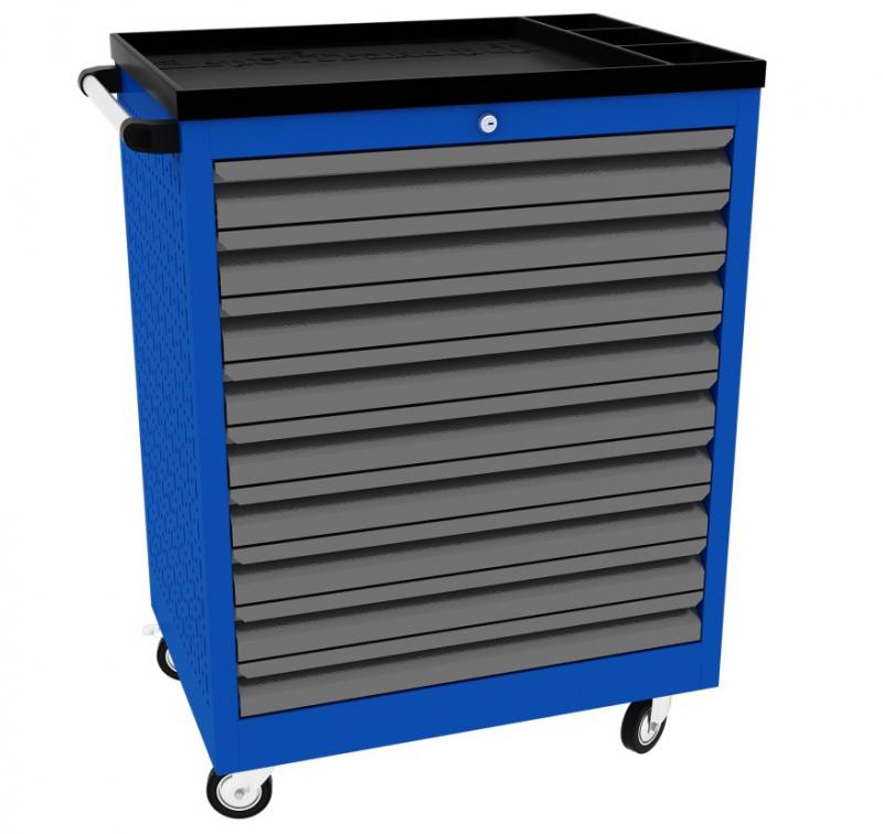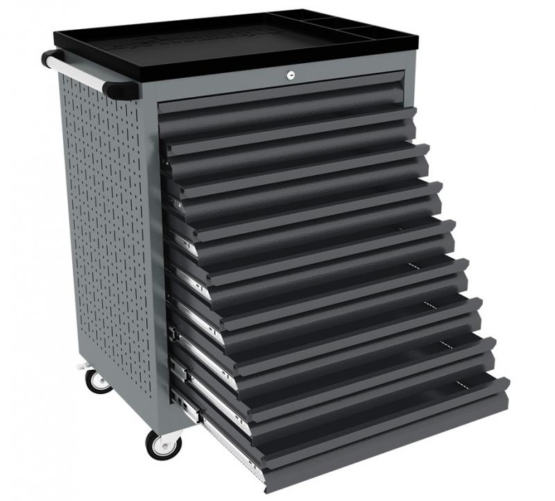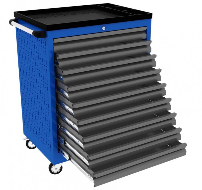 Тележки инструментальные серии PROFFI 950 предназначены для использования на предприятиях любого профиля занятых ремонтом и изготовлением различной продукции. На боковые стенки инструментальной тележки нанесена перфорация размером 25х25 мм и диаметром отверстия 8 мм, что позволяет устанавливать на них навесной инструмент или крючки. Наибольшей популярностью тележки инструментальные пользуются в сфере авторемонта и обслуживания автомобилей .Тележки имеют выдвижные ящики на шариковых телескопических направляющих полного выдвижения с фиксацией в закрытом положении, предотвращающее открывание при передвижении тележки. Ящики имеют центральный замок, который позволяет ограничить доступ посторонних лиц к содержимому ящиков. Тележка инструментальная изготовлена из высококачественного металла ведущих Российских производителей, покрашена порошковой краской производства Германии, имеет итальянскую и турецкую фурнитуру. Тележки для инструмента оснащены двумя не поворотными колесами диаметром 100 мм, одним поворотным и одним поворотным со стопором, которое фиксирует тележку и предотвращает непроизвольное скатывание.