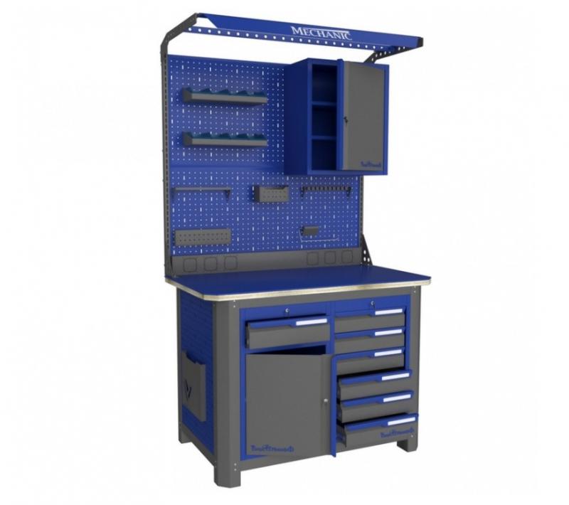 В состав рабочего места входит: Рама (металл 1,5 мм.), столешница (фанера 24 мм. + металл 6 мм.), 2 боковые перфорированные панели, модуль с дверцей, модуль с 6-ю выдвижными ящиками, блок розеток, комплект усиленных кронштейнов, 2 экрана, козырек с лампой освещения, навесной шкафчик, 2 полочки, 8 пластиковых контейнера, держатель универсальный, держатель для баллонов, держатель для ключей, держатель для отверток, держатель для бумажных полотенцев, кармашек.