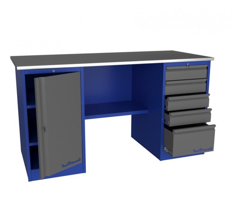 Верстак металлический двухтумбовый, PROFFI-216 Т Д5. Размеры: 870х1600х700мм, 1 тумба - 5 ящиков,1 тумба с дверью (2 полки), замки, полка, оцинк. столешница h=24 мм (фанера+оцинкованный металл 1мм). Нагрузка на столешницу 300кг.