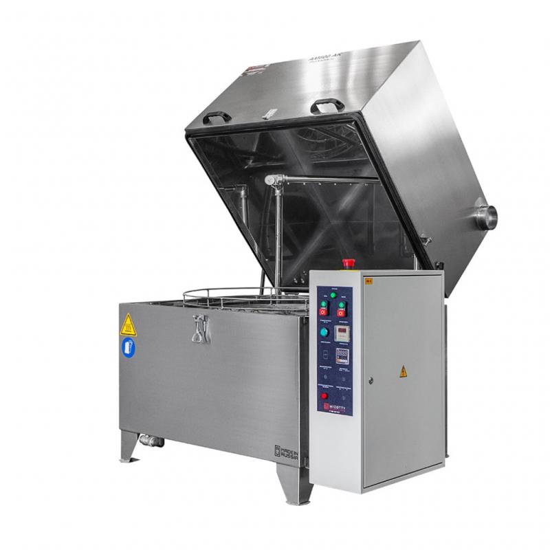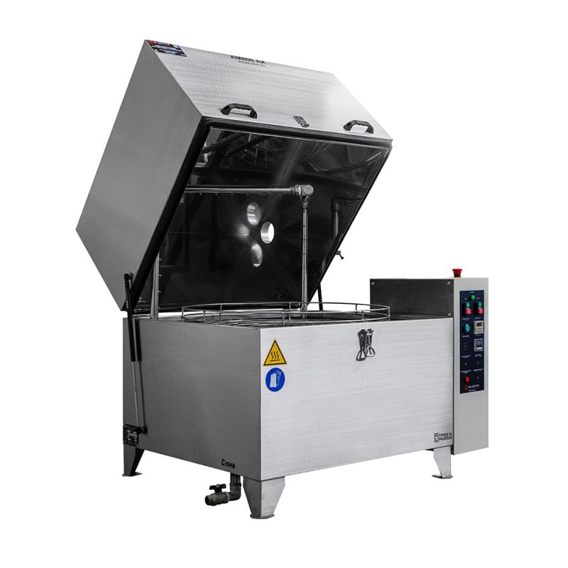 Диаметр корзины - 800 мм. Грузоподъемность корзины до 250 кг. Высота рабочего пространства – 500 мм. Итальянский насос! Сделано в России. Мойка для деталей ТС800 AК укомплектована электромеханическим приводом, надежным высокопроизводительным итальянским насосом, качественными фитингами, ТЭНами из нержавеющей стали, европейской электрикой. Корпус изделия выполнен из нержавеющей стали AISI430, толщиной 2 мм.