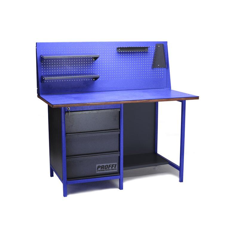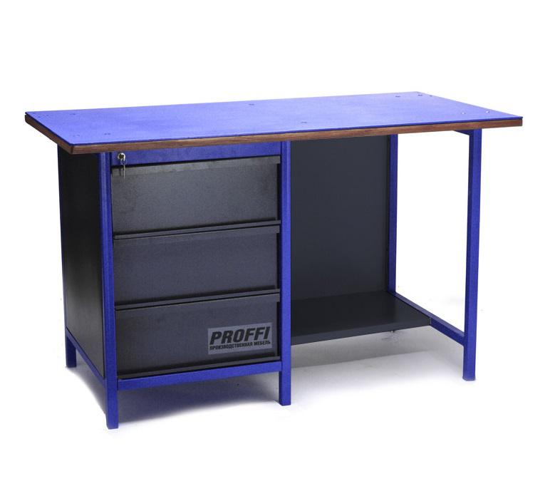 размеры: 1400 х 830 х 700 мм столешница: фанера 24 мм + стальной лист 6 мм корпус: три ящика + полка + опора и ножкиФанерная часть столешницы покрыта защитным слоем лакокрасочного типа. Полка с ящиками окрашены в серые тона для поддержания эстетического вида, даже после попадания на их поверхность каких-либо загрязнений. Все внутренние стенки так же окрашены в серые тона. В другой комплектации металлический слой заменяется 2-х мм накладкой.
