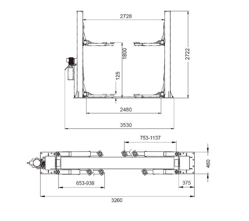 Г/П -3,5т. Подъём 125÷1800 мм. Ширина – 2728 мм. 220/380В. Гарантия 24 мес – наш монтаж, 12 мес – самостоятельная установка. Подхваты (лапы) – 4 прямых. Длина (min-max) лапа короткая 653-938 мм; лапа длинная 753-1137 мм.