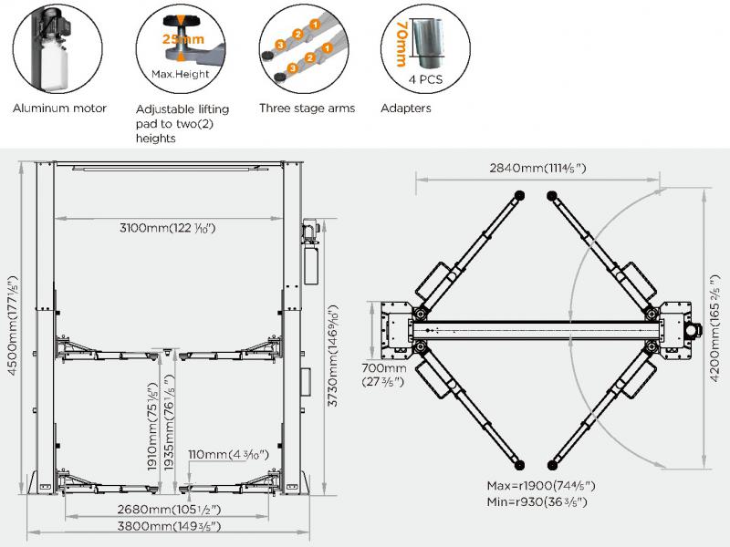 Поднимает автомобили с низкой посадкой h-min – 110 мм.