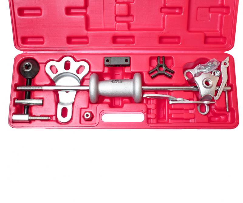 Комплектация Съемник 2-х захватный (внутренний/внешний). Съемник 3-х захватный (внутренний/внешний). Переходник под ключ. Съемник для кузовных работ. Съемник Г-образный. Съемник задней полуоси. Обратный молоток. Описание Универсальный инерционный съемник может быть использован для демонтажа полуоси, ступицы и барабанов, подшипников, шестерней, втулок, а также в работах жестянщика. Технические характеристики Обратный молоток 3 кг. Длина ручки: 570 мм. Двухлучевой съемник внешний: диапазон 50-140 мм, высота: 75 мм. Двухлучевой съемник внутренний: диапазон 35-110 мм, глубина: 82 мм. Трехлучевой съемник внешний: диапазон 20-135 мм, высота: 75 мм. Трехлучевой съемник внутренний: диапазон 50-135 мм, глубина: 82 мм.