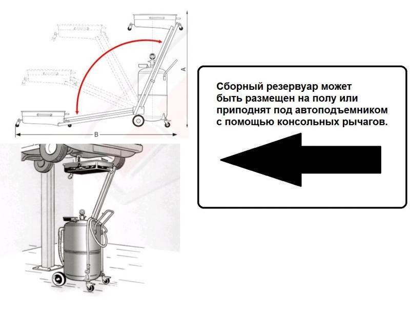 Сборный резервуар может быть размещен на полу или приподнят под автоподъемником с помощью консольных рычагов.