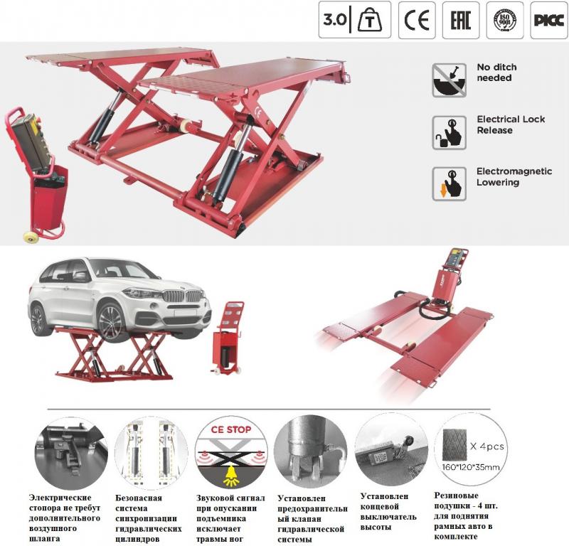 | ТХ (таблица) (Описание) : | Грузоподъемность, т 3,0 Высота подъема, мм 1000 Высота подхвата, мм 115 Длина платформ, мм 1460-2010 Ширина подъемника, мм 1810 Ширина платформ, мм 480 Расстояние между платформами, мм 850 Рабочее давление в гидросистеме, bar 18 – 20 Рабочее давление воздуха, bar 6-8 Время подъема/опускания, сек 30 Мощность электродвигателя, кВт 2,2 Электропитание, В 220 или 380 на выбор Напряжение в сети управления, В 24 Габариты брутто, мм место 1: 1800х1540х220 место 2: 520х450х1150 Масса, кг 550 |
