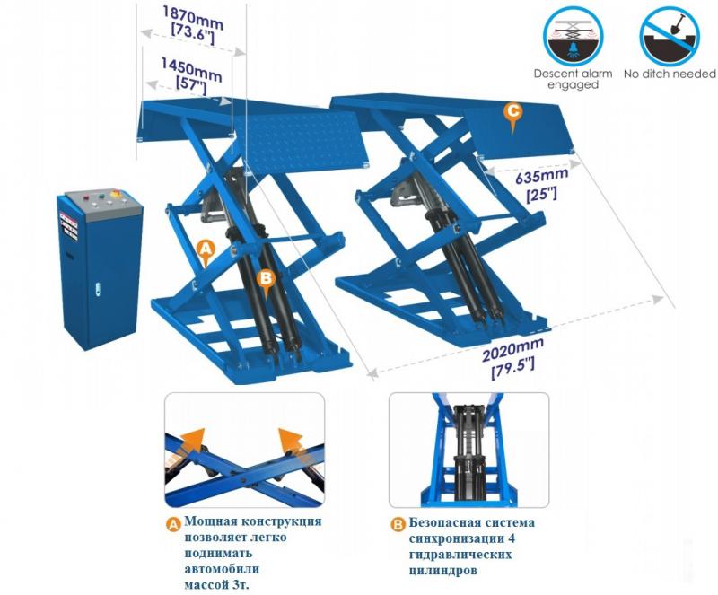 - Безопасная система синхронизации гидравлических цилиндров (автомобиль не упадет с подъемника)