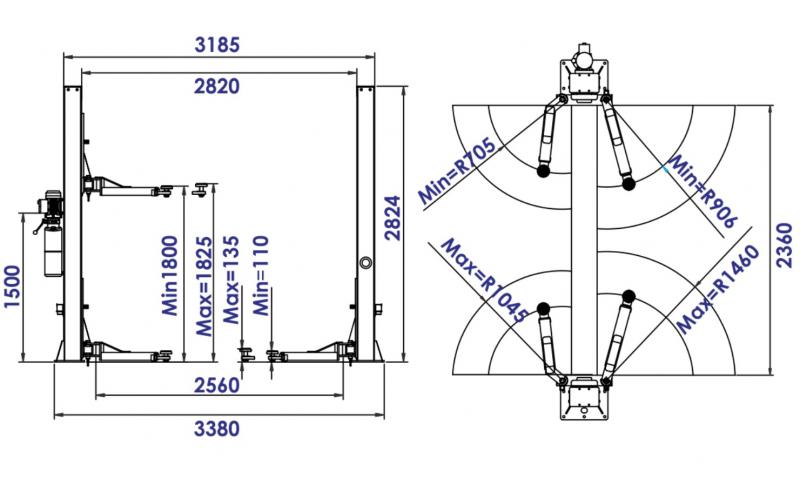 ТХ (таблица) (Описание) : Грузоподъемность, кг 4000 Мощность электромотора, кВт 2,2 Высота подхвата min-max, мм 110-1825 Время подъема, сек. 45-50 Расстояние между колонами подъемника, мм. 2820 Ширина проезда, мм 2560 Габаритная ширина подъемника, мм 3380 Габаритная высота стойки, мм 2824 Длина (min-max) лапа изогнутая (передняя), мм 705-1045 Длина (min-max) лапа прямая (задняя), мм 906-1460 Количество гидроцилиндров 2 Съем со стопоров электронный пульт на колонне Вес подъемника, кг 635 (625) Габариты в упаковке (ДхШхВ), мм 3000х600х800