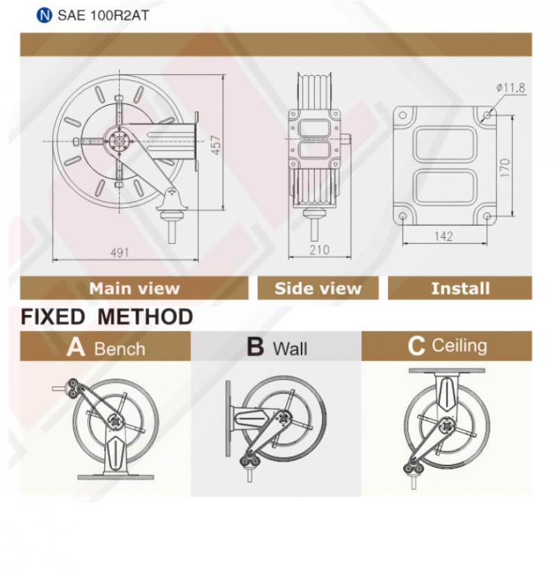 4) Направление: может быть зафиксировано в трех разных положениях в зависимости от установки барабана для шланга. Направляющая регулируется на 45 °, что облегчает использование при установке на тележке, стене или потолке.