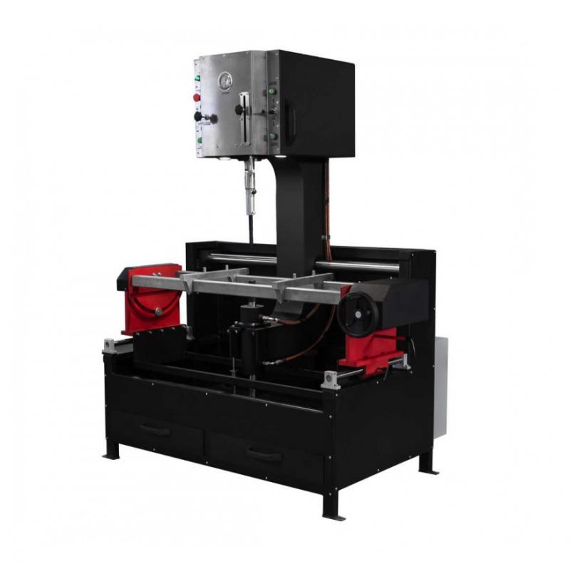 Технические особенности стенда: Прочная рамная конструкция Передвижная станина Гидроцилиндр с регулируемым усилием до 16 т. (Италия) Гидравлическая станция (Италия) Поворотный стол с ручным приводом и линейным перемещением Электрические компоненты Schneider Регулируемая подсветка рабочего пространства Комплект оснастки