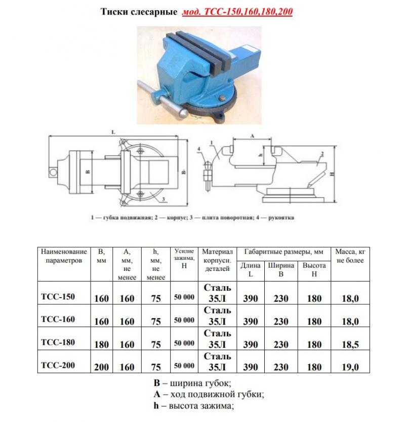 | ТХ (таблица) (Описание) : | Ширина губок, мм 160 Усилие зажима, Н 50 000 Материал корпуса сталь 35Л Ход подвижной губки, мм 160 Высота зажима 75 Габариты, ДхШхВ 390х230х180 Масса, кг ~18,8 |