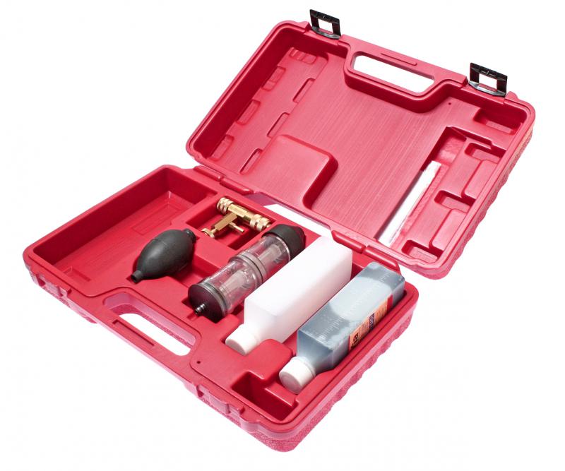 Набор представляет собой диагностическое устройство – тестер, с помощью которого можно определить содержания выхлопных газов в охлаждающей жидкости системы охлаждения двигателя автомобиля. Наличие выхлопных газов косвенно свидетельствует о проблемах, связанных с микротрещинами в камере сгорания, или неплотной прилегающей прокладке между блоком двигателя и ГБЦ и т.п., обычно возникающих после перегрева двигателя. Проверка производится при работе двигателя на холостом ходу. Местоположение утечки определяется путем отключения одной свечи зажигания за один раз и проведением повторного испытания. Рекомендуется использовать вместе с тестером JTC-1005.Принцип действия