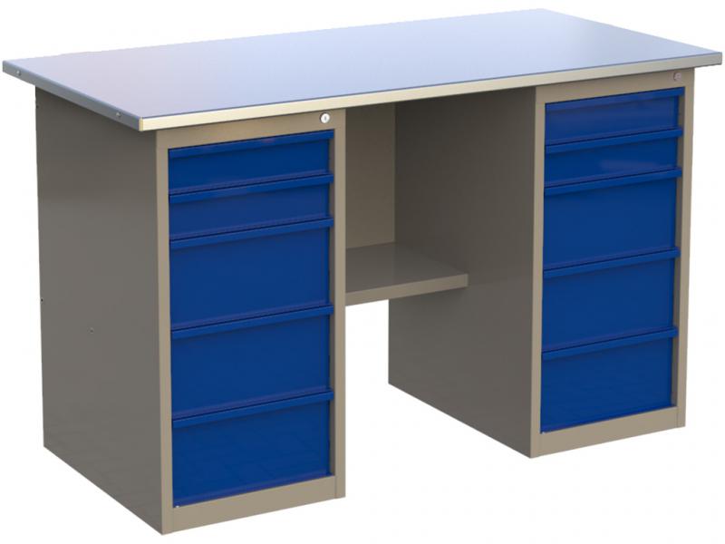 Верстак двухтумбовый поставляется в разобранном виде (4 элемента). Нагрузка на столешницу до 600 кг. Стандартный цвет: корпус - серый глянец RAL 7030, ящики и двери тумб - синий RAL 5017. Есть возможность установки стальной столешницы (3мм. сталь + 24 мм. МДФ). Размеры:855x1400x700 мм. Масса: 111 кг.