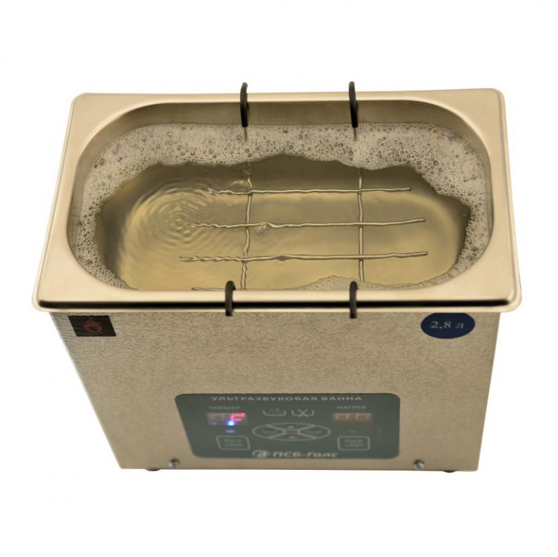 Ультразвуковые ванны объём 2,8 л., предназначены для очистки изделий от жиров, масел, полировальных паст и других технологических загрязнений; получения стойких эмульсий из несмешиваемых жидкостей; измельчения (диспергации) твёрдых и жидких частиц; ускорения химических реакций; смешивания и перемешивания. Очистка изделий производится в водных растворах с добавлением технических моющих средств. Корпус ванны и рабочая область выполнены из нержавеющей стали.