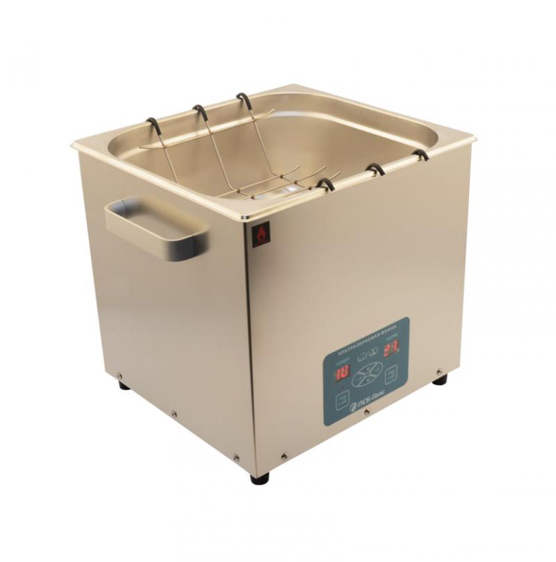 Ультразвуковые ванны объём 14 л., предназначены для очистки изделий от жиров, масел, полировальных паст и других технологических загрязнений; получения стойких эмульсий из несмешиваемых жидкостей; измельчения (диспергации) твёрдых и жидких частиц; ускорения химических реакций; смешивания и перемешивания. Очистка изделий производится в водных растворах с добавлением технических моющих средств. Корпус ванны и рабочая область выполнены из нержавеющей стали.