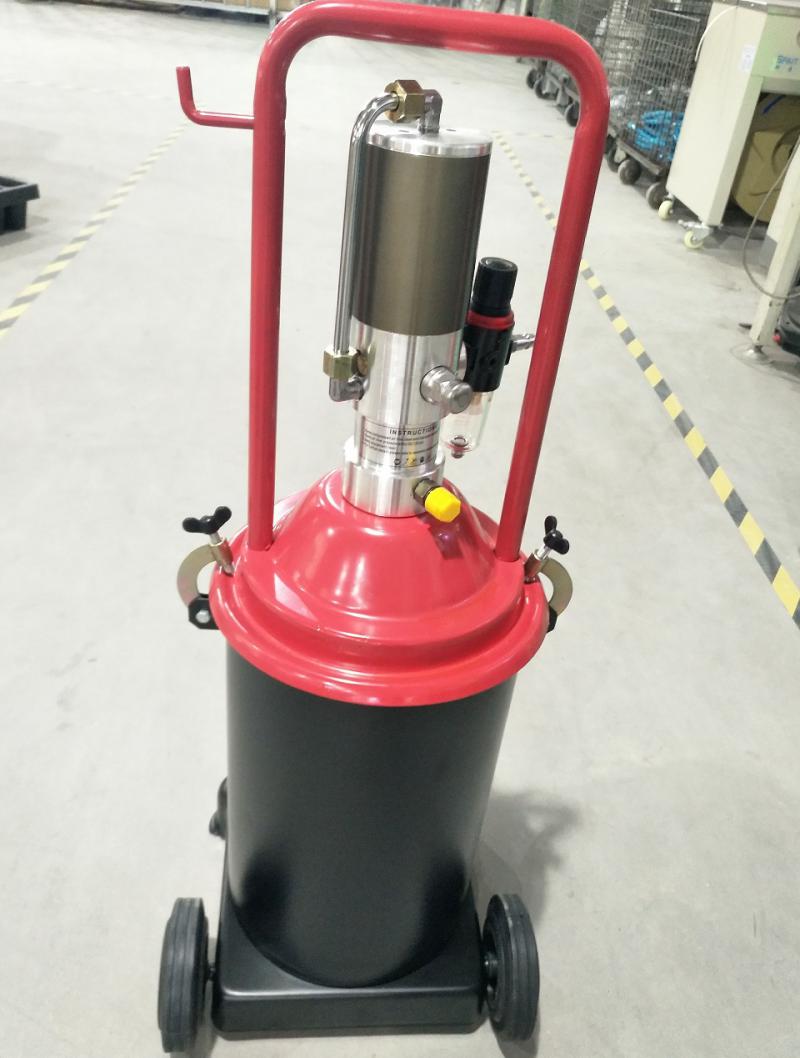 Для удобства транспортировки нагнетатель оборудован металлической ручкой в верхней части корпуса и двумя обрезиненными колесами. Нагнетатель оборудован маслобензостойким армированным шлангом длиной 4м. Маслораздаточный пистолет оборудован шарнирным механизмом (вращение на 360град) для удобства подачи смазки в труднодоступные места.