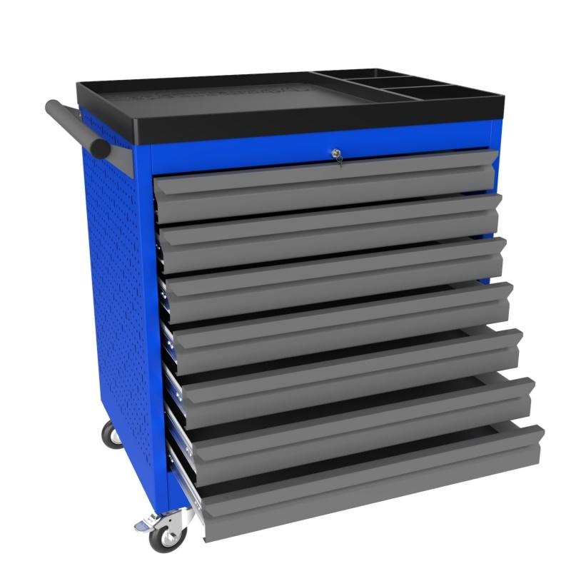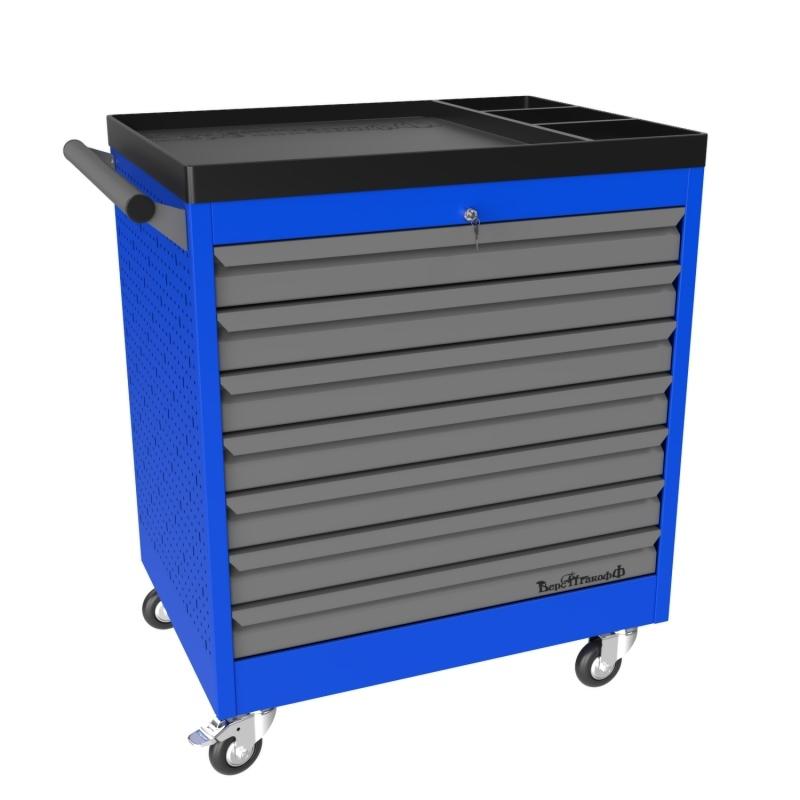 Корпусные элементы выполнены из стали 0,6 мм. Выдвижные ящики выполнены из стали 0,8 мм, в отличие от стандартных тележек у которых ящики выполнены из стали 0,6 мм. Доработаны выдвижные ящики - добавлена система фиксации, что предотвращает их произвольное открывание. Установлены усиленные направляющие на зацепах. Установлено усиление крепления ручек. Увеличена нагрузка на ящики до 30 кг. Общая нагрузка на тележку до 220 кг. Стандартная цветовая гамма: корпус-RAL5005 шагрень / ящики, ручка-RAL7024 шагрень. Тележка инструментальная на колесах (7 ящиков) 7-ми полочная инструментальная тележка на колесах серии PROFFI 795 предназначена для использования в автосервисах и ремонтных мастерских, а также других предприятиях, специализирующихся на изготовлении деталей и различной продукции. Высота 795 мм позволяет разместить тележку под верстаками и рабочими столами PROFFI. Эта конструктивная особенность отлично экономит рабочее пространство в мастерской.Окраска: порошковая краска (производства Германии)