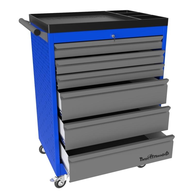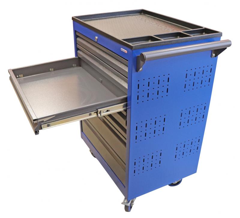 Тележки инструментальные серии PROFFI 950 предназначены для использования на предприятиях любого профиля занятых ремонтом и изготовлением различной продукции. На боковые стенки инструментальной тележки нанесена перфорация размером 25х25 мм и диаметром отверстия 8 мм, что позволяет устанавливать на них навесной инструмент или крючки. Наибольшей популярностью тележки инструментальные пользуются в сфере авторемонта и обслуживания автомобилей .Тележки имеют выдвижные ящики на шариковых телескопических направляющих полного выдвижения с фиксацией в закрытом положении, предотвращающее открывание при передвижении тележки. Ящики имеют центральный замок, который позволяет ограничить доступ посторонних лиц к содержимому ящиков. Тележка инструментальная изготовлена из высококачественного металла ведущих Российских производителей, покрашена порошковой краской производства Германии, имеет итальянскую и турецкую фурнитуру. Тележки для инструмента оснащены двумя не поворотными колесами диаметром 100 мм, одним поворотным и одним поворотным со стопором, которое фиксирует тележку и предотвращает непроизвольное скатывание.