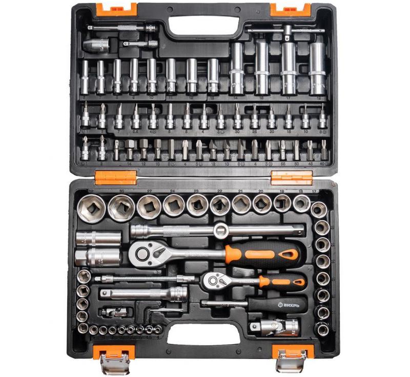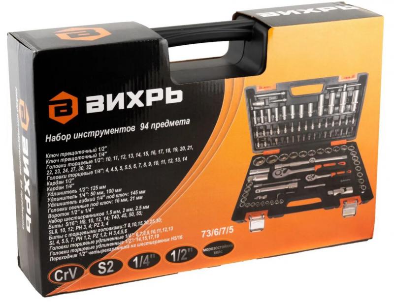 Набор инструмента ВИХРЬ в чемодане 94 предмета предназначен для ремонта автомобилей, мотоциклов, садовой и другой техники. Подходит как для использования на станциях технического обслуживания, так и в бытовом применении дома или на даче. Инструмент изготовлен в соответствии с международными стандартами. Головки и комбинированные ключи изготовлены из хромованадиевой стали, придающей инструменту высокую твердость и легкость. Биты, биты-вставки и отвёртки производятся из стали S2, улучшающей характеристики крутящего момента и твёрдости. Все наборы упакованы в кейс, изготовленный из жесткого противоударного пластика, с металлическими застёжками.