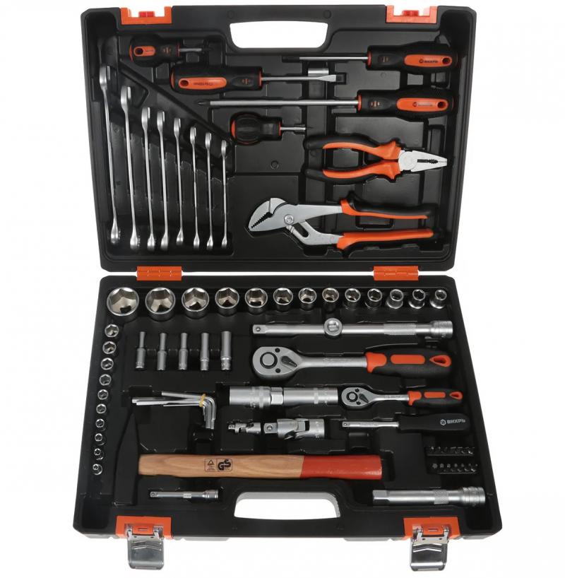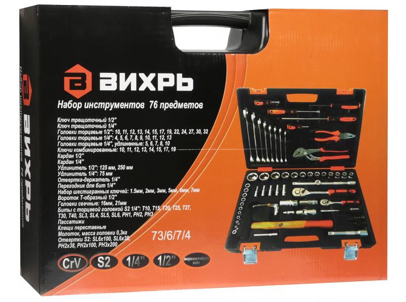 Набор инструмента ВИХРЬ предназначен для ремонта автомобилей, мотоциклов, садовой и другой техники. Подходит как для использования на станциях технического обслуживания, так и в бытовом применении дома или на даче. Инструмент изготовлен в соответствии с международными стандартами. Головки и комбинированные ключи изготовлены из хромованадиевой стали, придающей инструменту высокую твердость и легкость. Биты, биты-вставки и отвёртки производятся из стали S2, улучшающей характеристики крутящего момента и твёрдости. Все наборы упакованы в кейс, изготовленный из жесткого противоударного пластика, с металлическими застёжками.