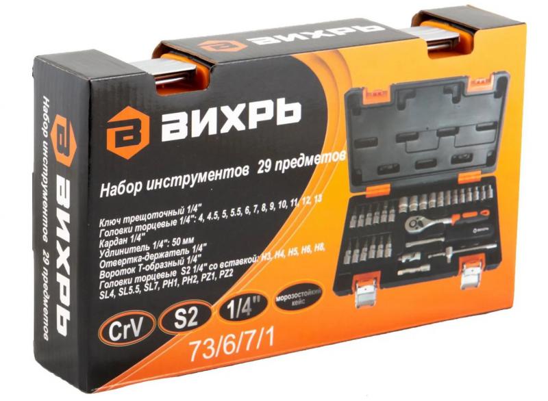 Набор инструмента ВИХРЬ предназначен для ремонта автомобилей, мотоциклов, садовой и другой техники. Подходит как для использования на станциях технического обслуживания, так и в бытовом применении дома или на даче. Инструмент изготовлен в соответствии с международными стандартами. Головки и комбинированные ключи изготовлены из хромованадиевой стали, придающей инструменту высокую твердость и легкость. Биты, биты-вставки и отвёртки производятся из стали S3, улучшающей характеристики крутящего момента и твёрдости. Все наборы упакованы в ударопрочный кейс, изготовленный из жесткого противоударного пластика, с металлическими застёжками. Повышенные показатели прочности, крутящего момента и износостойкости.