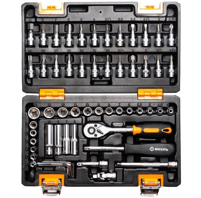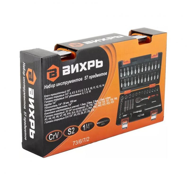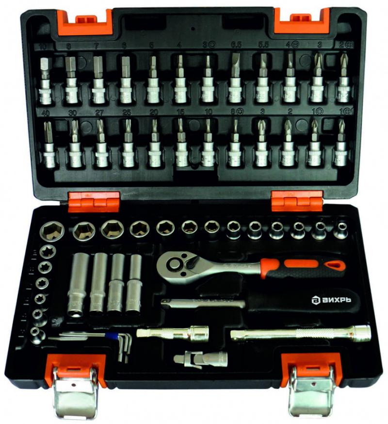 Набор инструмента ВИХРЬ в чемодане 57 предметов предназначен для ремонта автомобилей, мотоциклов, садовой и другой техники. Подходит как для использования на станциях технического обслуживания, так и в бытовом применении дома или на даче. Инструмент изготовлен в соответствии с международными стандартами. Головки и комбинированные ключи изготовлены из хромованадиевой стали, придающей инструменту высокую твердость и легкость. Биты, биты-вставки и отвёртки производятся из стали S2, улучшающей характеристики крутящего момента и твёрдости. Все наборы упакованы в кейс, изготовленный из жесткого противоударного пластика, с металлическими застёжками.