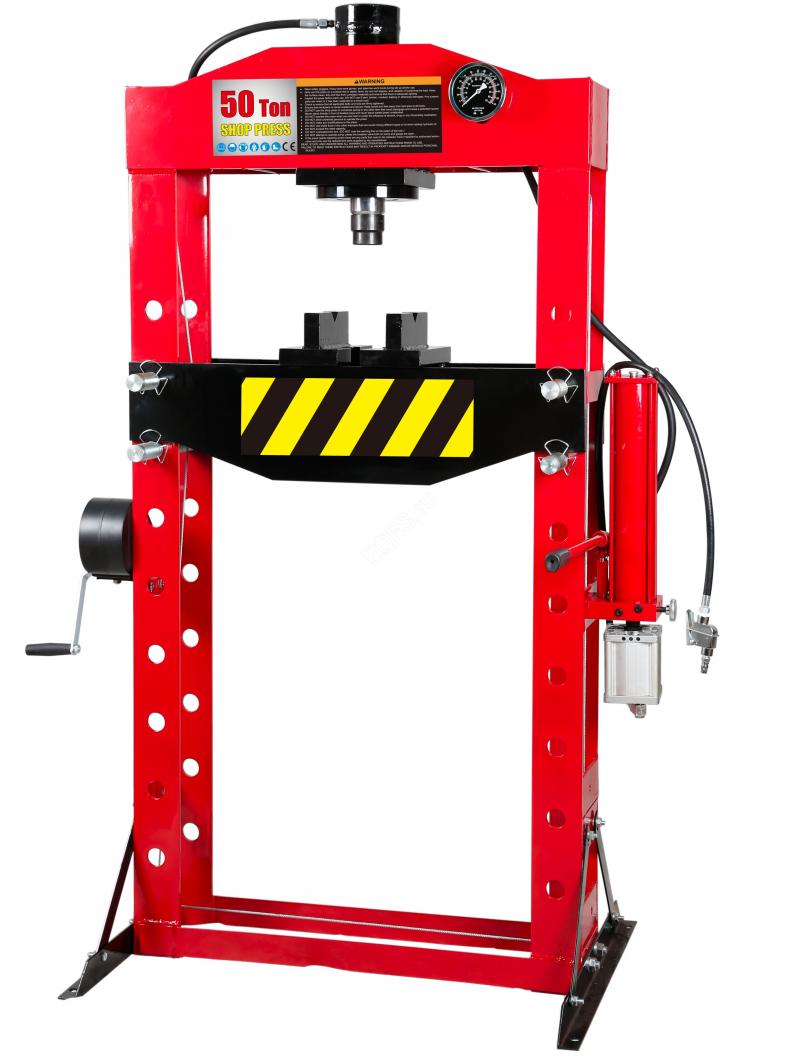 Конструктивные особенности пресс гидравлический 50 тонн: Полностью сварная конструкция рамы (нет болтовых соединений) Ход поршня 0-220 мм Пресс гидравлический оснащен ручной лебедкой Регулируемый по высоте рабочий стол Гидравлический насос с ручными и пневматическим приводом Встроенный клапан для защиты от перегрузок Индикатор крайнего положения цилиндра Манометр заполненный глицерином В комплект поставки входят две металлические трапеции для удобной запрессовки подшипников. Пресс гидравлический поставляется в сборе. Упаковка – фанерный короб.
