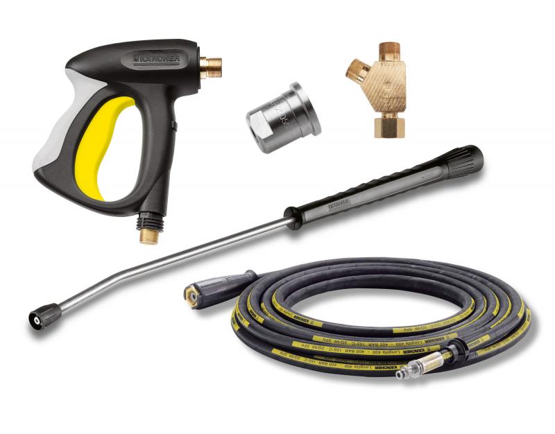 Комплект обеспечивает возможность одновременной работы двух операторов. Состоит из тройника, рабочего инструмента (шланг высокого давления + струйная трубка (копье) + пистолет) и двух мощных сопел. Предназначен для аппаратов HDS экстра класса.