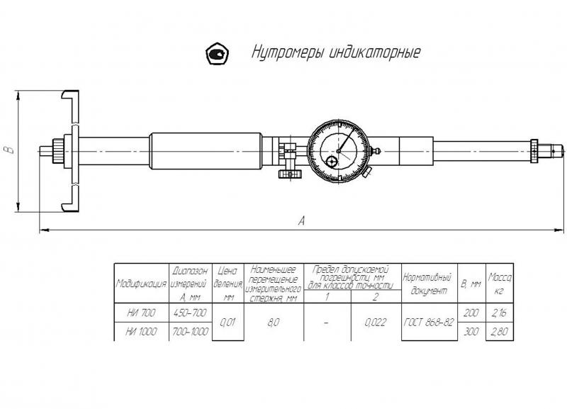 Нутромеры индикаторные с ценой деления 0,01 мм. Предназначен для измерения внутренних размеров от 700 до 1000 мм. В нутромерах НИ 700 и НИ 1000 подвижный измерительный стержень контактирует непосредственно с отсчетным устройством. Измерительные поверхности стержней оснащены твердым сплавом. Класс точности 1. ГОСТ 868-82. Поставляется в двух вариантах с поверкой и без поверки!