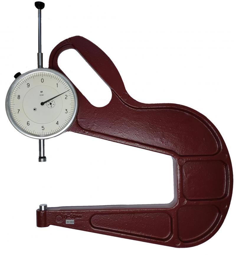 Толщиномер представляет собой скобу, в которой сверху расположено отсчетное устройство с измерительным наконечником , а снизу запрессована пятка. У толщиномера без нормированного измерительного усилия измерительный стержень возвращается в исходное положение возвратной пружиной.