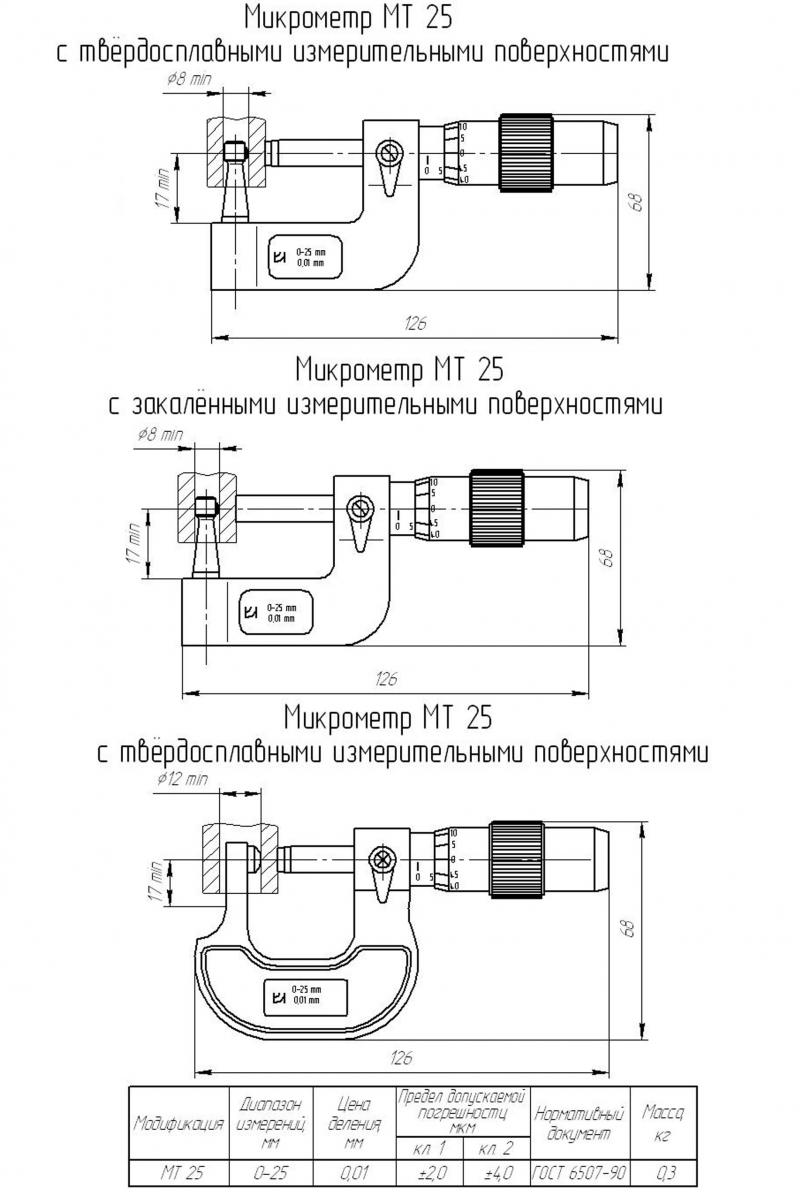 Пример условного обозначения микрометра 1-го класса точности с наименьшим внутренним диаметром измеряемых труб 8 мм - Микрометр МТ25-1-8 ГОСТ 6507-90.