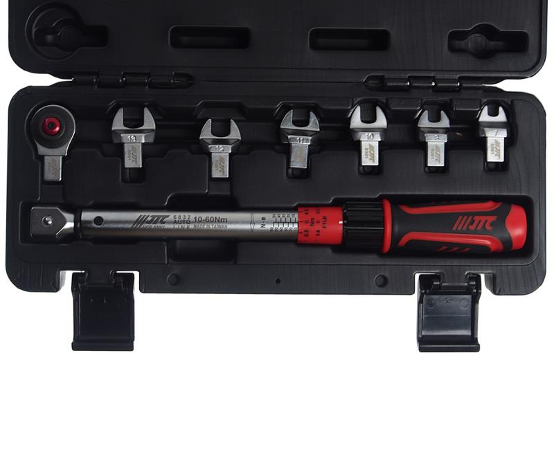 JTC-6832 9x12 (10-60 Н·м). Храповая головка JTC-509003 9x12 3/8"Dr Головки торцевые 9x12: 7, 8, 10, 11, 12, 13 мм. Порядок работы Выбрать необходимое усилие для конкретного действия по затяжке, рекомендуемое производителем. Настроить необходимое значение, проворачивая рукоятку до тех пор, пока значение не появится на шкале. Чтобы зафиксировать момент, поверните по часовой стрелке черное кольцо до отметки "Lock". Во время работы при достижении необходимого усилия инструмент произведет щелчок. Чтобы разблокировать, поверните черное кольцо до отметки "Unlock".Важные рекомендации