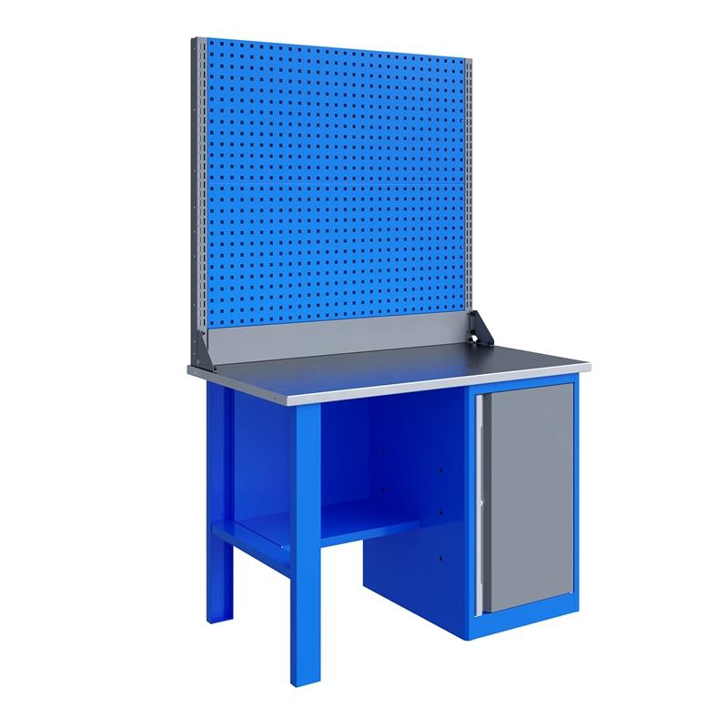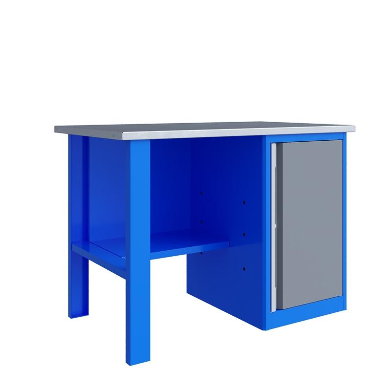 Однотумбовый. Допустимая нагрузка на столешницу 750 кг. Опорные элементы выполнены сварными из холоднокатаной стали. Для выполнения сборочных, ремонтных, слесарных, монтажных и других видов работ на производстве, в сервисных центрах, мастерских, гаражах, а также для обучения технологии в учебных заведениях. Комплектуется полкой-стенкой, расположенной под столешницей для удобного размещения габаритного инструмента и оснастки. Размеры верстака: 855x1396x696 мм. Вес: 60 кг. Поставляется в 4 комплектациях на выбор.