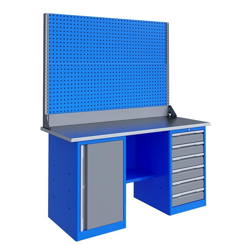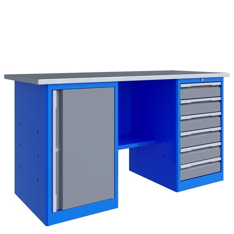 Верстак серии PRF: Верстакофф ® PRF 161.67.1 состоит из столешницы шириной 1596 мм, тумбы P6 с шестью малыми ящиками, тумбы P7 с дверью и двумя полками и полки-стенки.