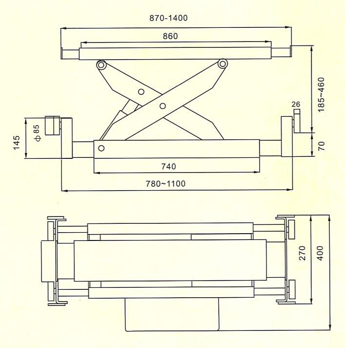 Гидравлическая траверса с ручным управлением, грузоподъёмность 2 тонны, опорные ролики для рельсовых направляющих. Г/П 2т. Ручной привод. Для ямы шириной 780-1100 мм. На канаву (яму) или четырехстоечный подъемник. Ширина платформ регулируется 870-1400 мм. Высота подъема мин/макс 185-460 мм.