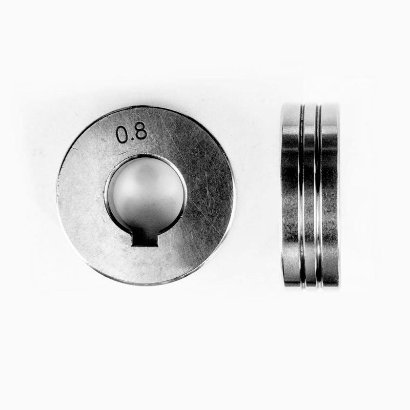 Подающие ролики, обычно, имеют две направляющие канавки сходного размера: 0.6/0.8мм, 0.8/1.0мм, 1.0/1.2мм и т.д. Сварщик при изменении сечения проволоки может перевернуть ролик нужной стороной и использовать его для подачи той проволоки, которая необходима в данный момент.