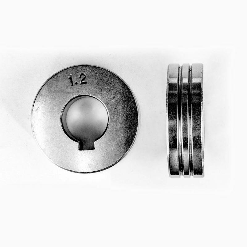 Подающие ролики, обычно, имеют две направляющие канавки сходного размера: 0.6/0.8мм, 0.8/1.0мм, 1.0/1.2мм и т.д. Сварщик при изменении сечения проволоки может перевернуть ролик нужной стороной и использовать его для подачи той проволоки, которая необходима в данный момент.