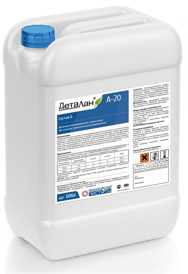 Концентрированное жидкое щелочное средство предназначено для очистки и обезжиривания металлов в различных процессах: перед травлением в процессе горячего цинкования, перед нанесением защитных покрытий (перед операциями гальванопокрытия, окраски и фосфатирования), для межоперационной очистки узлов и деталей на машиностроительных и ремонтных предприятиях, в строительстве, на транспорте и других отраслях промышленности. Эмульгирующие свойства рабочего раствора позволяют использовать моющие растворы в многооборотном режиме без специальной регенерации. При правильном применении средство не оказывает отрицательного воздействия на щелочестойкие поверхности. Экологически безопасно, биоразлагаемо. Средство Деталан А-20 используется как оптимизированная композиция из двух составов: состав А (арт.006а) и состав Б (арт.006б), которые используются в соотношении 1:1,5. Состав Б - концентрированная слабо щелочная жидкость на основе ПАВ с высоким пенообразованием.