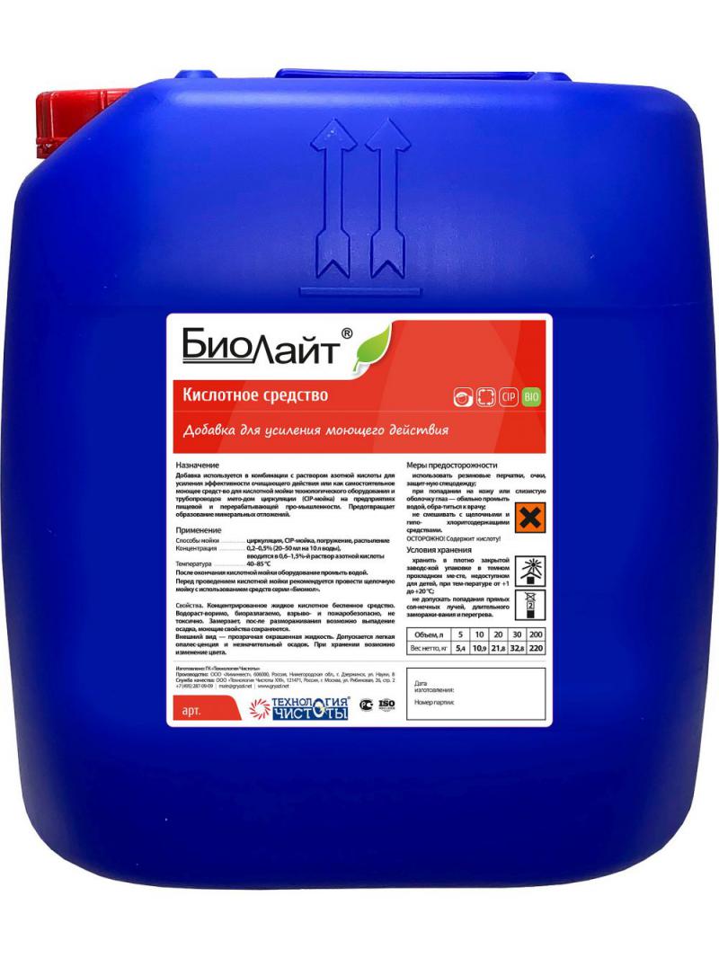Концентрированное жидкое кислотное беспенное средство на основе органических кислот и моющих добавок рекомендуется использовать в комбинации с раствором азотной кислоты или как самостоятельное моющее средство для кислотной мойки оборудования и поверхностей на предприятиях пищевой и перерабатывающей промышленности. Средство применяется для усиления эффективности действия азотной кислоты с целью удаления сложных минерально-органических отложений, таких как пивной и молочный камень, накипь, соли кальция и магния, остатки протеинов, жиров, жрожжей. Средство обладает смачивающими, диспергирующими и хорошими моющими свойствами. Применение добавки позволяет снижать количество используемой азотной кислоты и сократить время мойки. Не оказывает коррозионного воздействия на кислотостойкие поверхности, нержавеющую сталь (отеч. марки 08Х18Н10, 08Х18Н10Т; имп. AISI 304, AISI 316). Не применять для алюминиевых сплавов и оцинкованных поверхностей. Не содержит фосфатов. Экологически безопасно, биоразлагаемо.