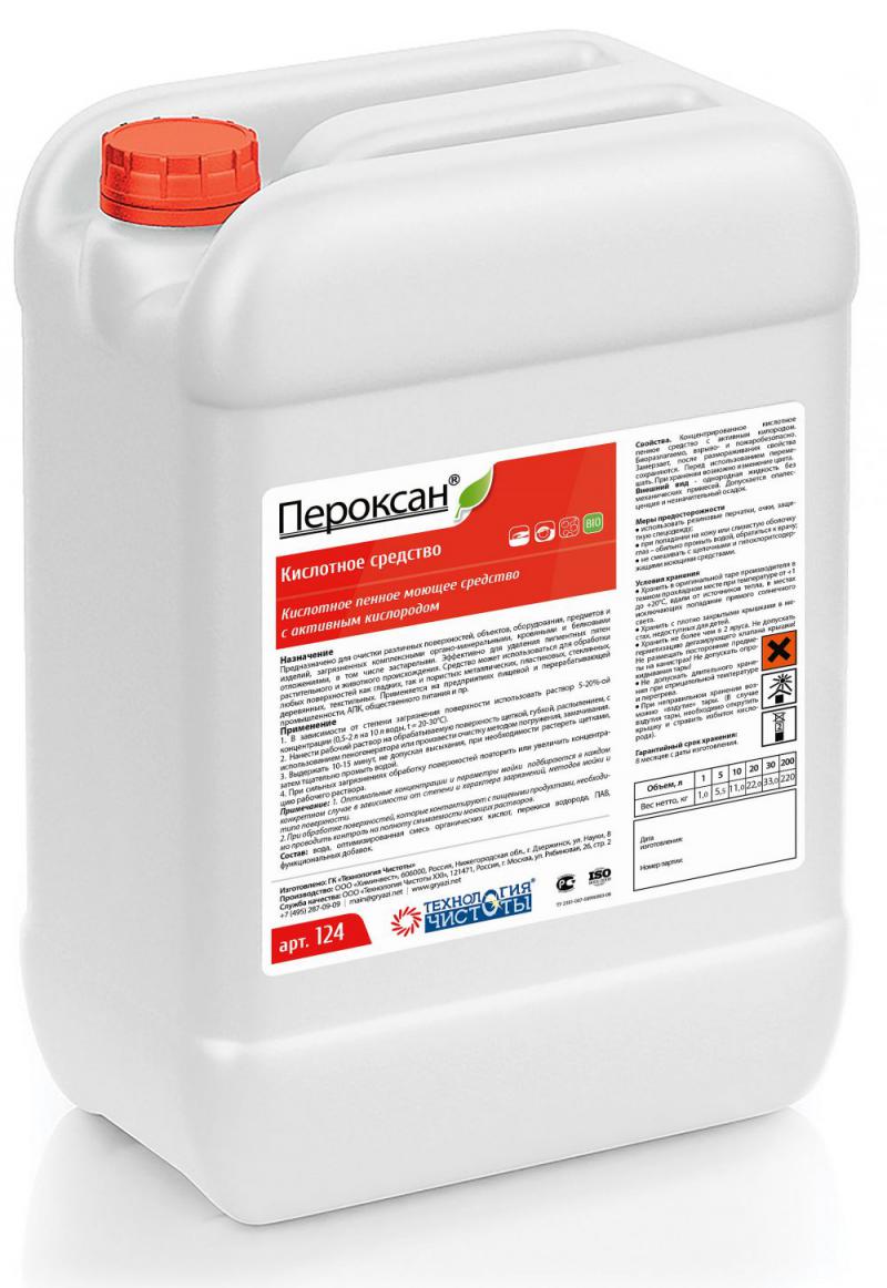 Концентрированное кислотное пенное средство, содержащее активный кислород, предназначено для очистки различных поверхностей, объектов, оборудования, предметов и изделий, загрязненных комплексными органо-минеральными, кровяными и белковыми отложениями, в том числе застарелыми. Эффективно для удаления пигментынх пятен растительного и животного происхождения. Средство может использоваться для обработки любых поверхностей как гладких, так и пористых: металлических, пластиковых, стеклянных, деревянных, текстильных. Применяется на предприятиях пищевой и перерабатывающей промышленности, АПК, общественного питания и пр. Эффективно для удаления застарелых отложений крови, (разрушает порфириновые комплексы гемоглобина крови), пигментных пятен растительного и животного происхождения. Обладает умеренным бактерицидным действием, отбеливающим эффектом, устраняет запахи. Не оказывает отрицательного воздействия на обрабатываемые поверхности и кислотостойкие материалы. Экологогически безопасно, биоразлагаемо.