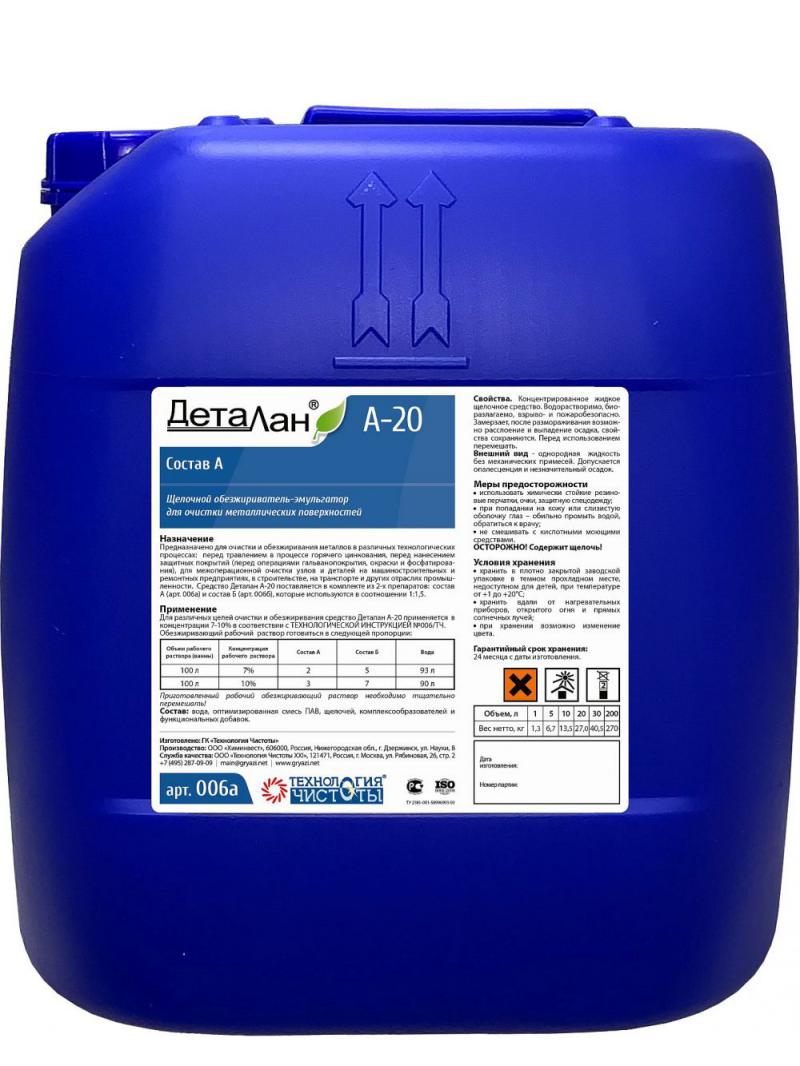 Концентрированное жидкое щелочное средство предназначено для очистки и обезжиривания металлов в различных процессах: перед травлением в процессе горячего цинкования, перед нанесением защитных покрытий (перед операциями гальванопокрытия, окраски и фосфатирования), для межоперационной очистки узлов и деталей на машиностроительных и ремонтных предприятиях, в строительстве, на транспорте и других отраслях промышленности. Эмульгирующие свойства рабочего раствора позволяют использовать моющие растворы в многооборотном режиме без специальной регенерации. При правильном применении средство не оказывает отрицательного воздействия на щелочестойкие поверхности. Экологически безопасно, биоразлагаемо. Средство Деталан А-20 используется как оптимизированная композиция из двух составов: состав А (арт.006а) и состав Б (арт.006б), которые используются в соотношении 1:1,5. Состав А - концентрированная высоко щелочная жидкость с умеренным пенообразованием.
