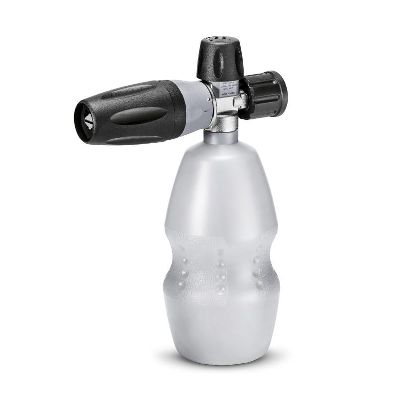 Эргономичная, компактная насадка для нанесения чистящего раствора в виде пены (пенокомплект). Совместима с аппаратами с функцией Servo Сontrol (регулировка давления и потока воды). Диаметр форсунки 025 (1,25 мм). Насадка оснащена емкостью объемом 1 литр для химического средства, вентилем для плавной регулировки качества пены и регулятором угла распыла струи. Вращающийся присоединительный резьбовой разъем M22 х 1,5.
