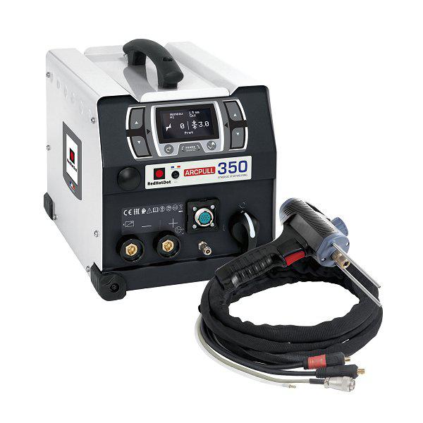 SPOT ARCPULL 350 - однофазный инверторный споттер ударно-дуговой сварки, разработанный для выправки обшивки и сложных деталей кузова автомобиля из алюминия или стали. Аппарат приваривает стержни для извлечения заклёпок, шпильки диаметром до 8 мм, изоляционные гвозди, тяговые кольца. Работает в двух режимах: ручном и синергическом. Цифровое управление позволяет корректировать параметры сварки.