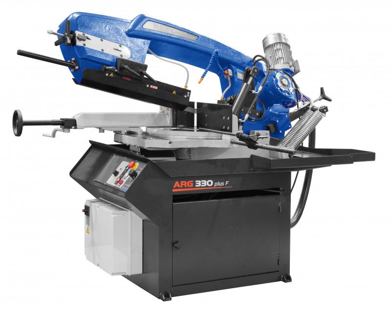 Совершенно новая технология литья пильной рамы и обновленный уникальный дизайн. Литье корпуса рамы выполнено с полыми карманами, проходящими по всей длине рамы, что позволило добиться большей жесткости рамы и повышения точности реза. Станок ARG 330 H.F. произведён в Чехии на заводе Pilous в городе Есенице, является эталонным станком по своим мощностным характеристикам. Использование прочной, широкой ленты является оптимальным выбором для обеспечения всех потребностей производства, полотно с шириной 34 мм и толщиной 1.1 мм, мощность 3 кВт, позволяющие использовать данный станок для распиловки труднообрабатываемых материалов с большими сплошными сечениями, в том числе нержавеющих и инструментальных сталей. Станок относится к классу маятниковых станков с консольным закреплением пильной рамы и позволяет резать заготовки под углом от -45º до + 60º. Подъём рамы производиться автоматически от нажатия кнопки «Start», блокирующей гидравлику и поднимающий раму. Опускание рамы производится за счёт системы гидроразгрузки с настройкой скорости опускания рамы. Производительность станка равна и сопоставима с производительностью полуавтоматических станков, за счёт жёсткой литой рамы и гидравлической системы станка.